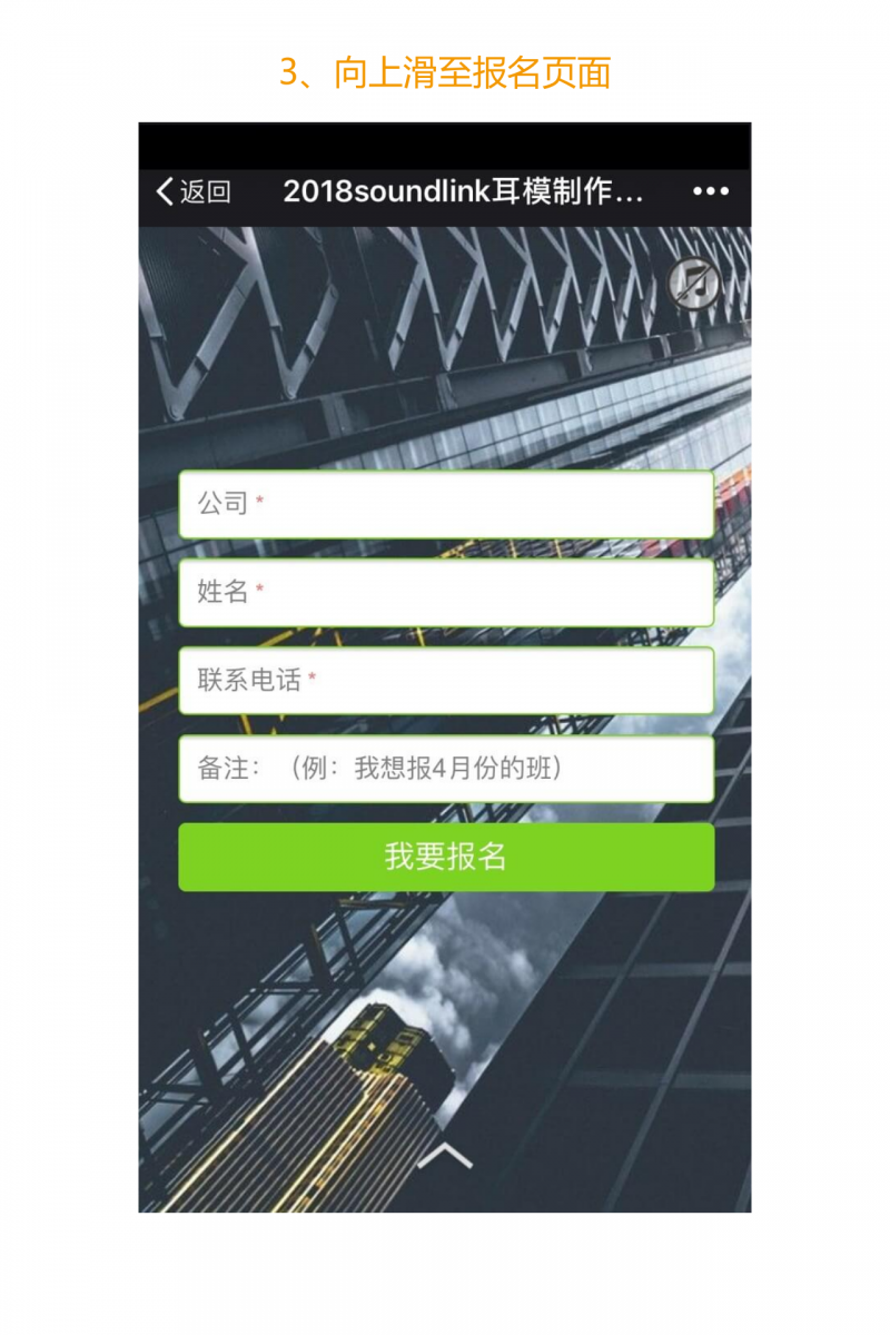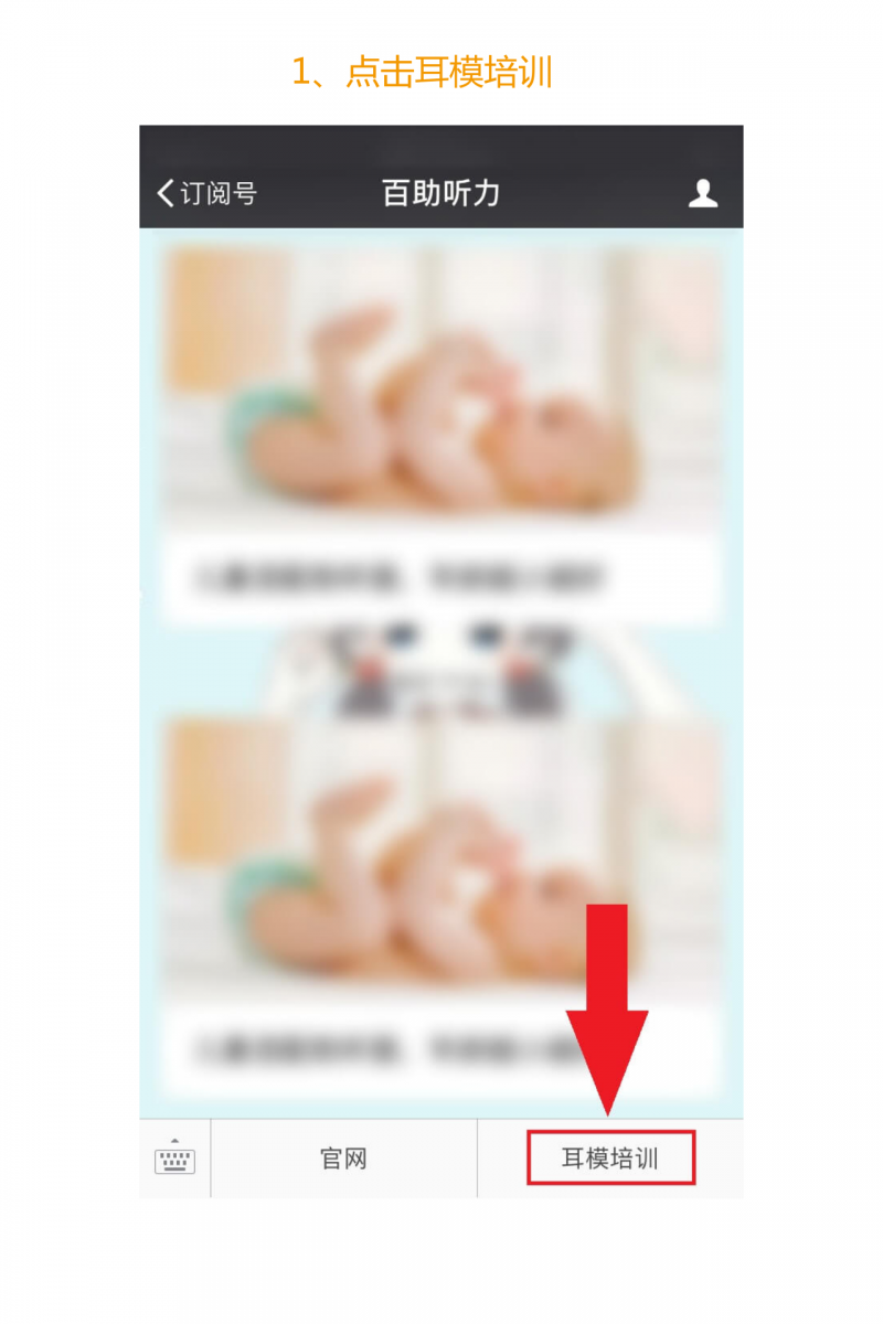2、進入百助聽力微信公眾平臺賬號,在下方菜單欄中點擊“耳模培訓”進入報名頁面;
